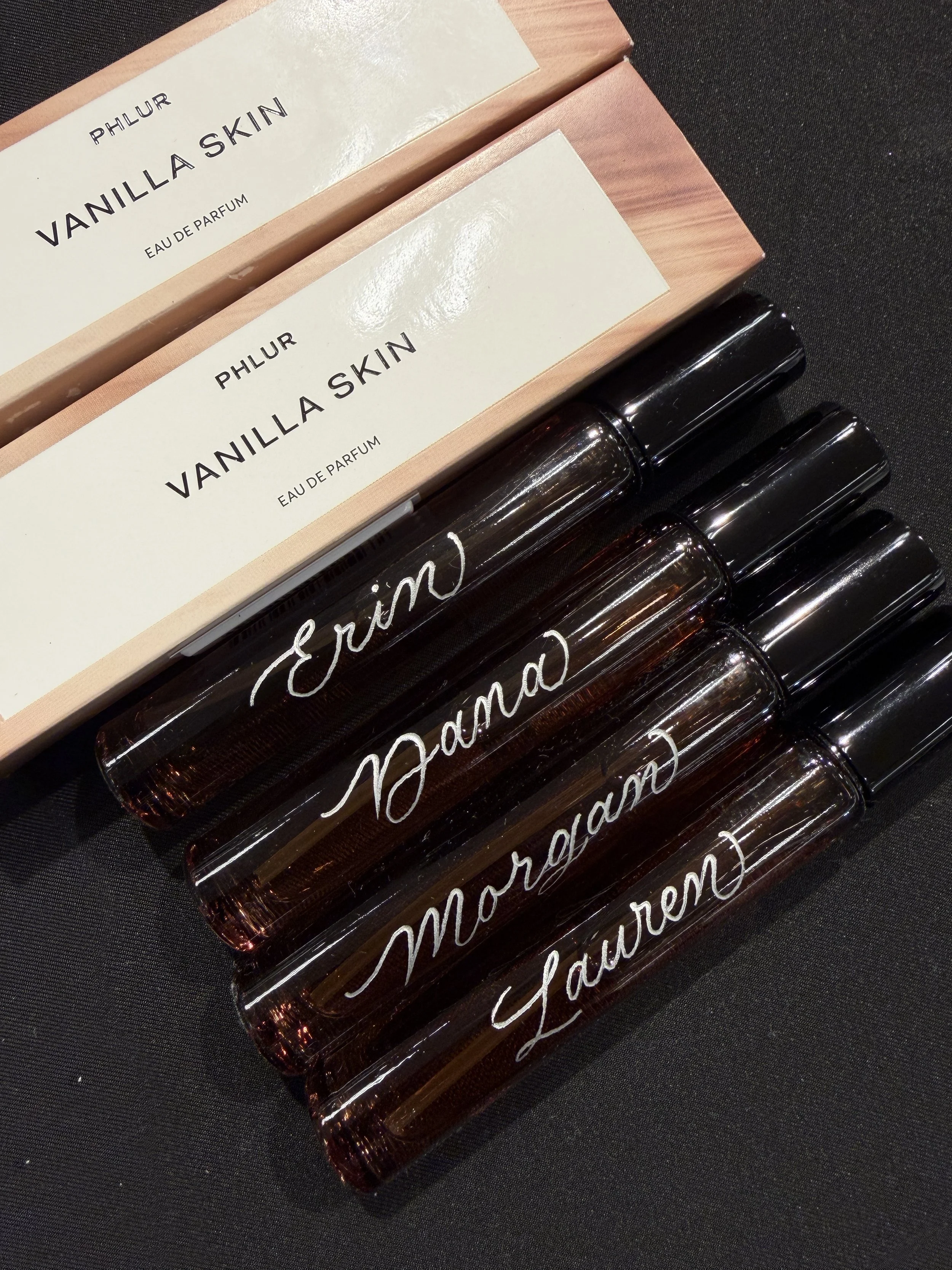 Almost anything can be personalized. Surfaces such as paper, glass, metal, ceramic, leather, and select plastics work beautifully for live customization. Popular items include wine bottles, perfume bottles, jewelry trays, candles, ornaments, luggage tags, thank you cards, shot glasses, makeup bags, tumblers, mirrors, pumpkins, and wine glasses.