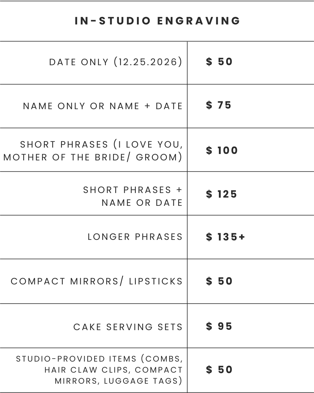 In-studio engraving is priced per piece and varies depending on the item, quantity, and level of detail. Every project is personalized by hand, so final pricing reflects the materials, design complexity, and personalization requested.